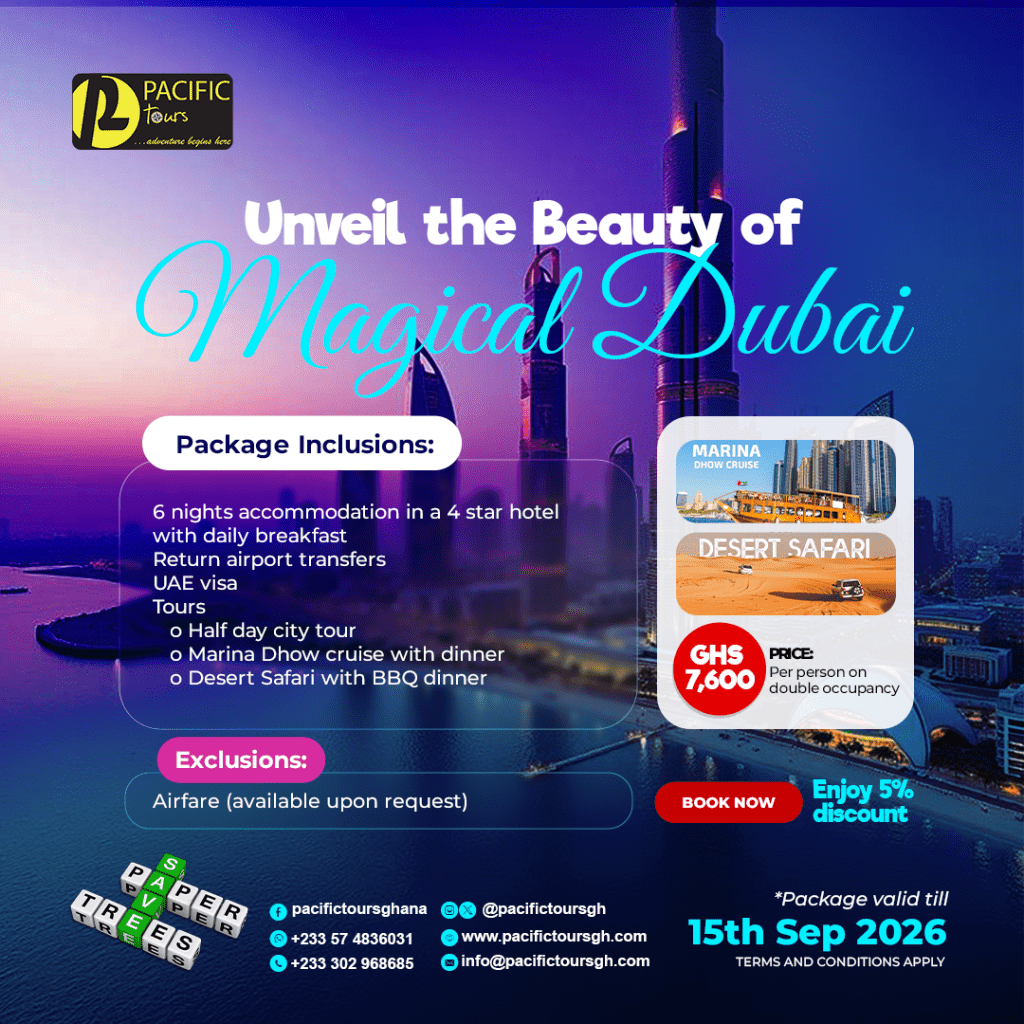 I entrusted Pacific Tours Ghana with my trip and tour to South Africa and it is safe to say that they didn’t disappoint me at all. Right from visa acquisition to ticketing and planning of the tour. Hotel accommodation and airport transfers. Everything went smoothly. What I loved most was the fact that they stayed up at night to ensure I had landed safely and checked in at my hotel.